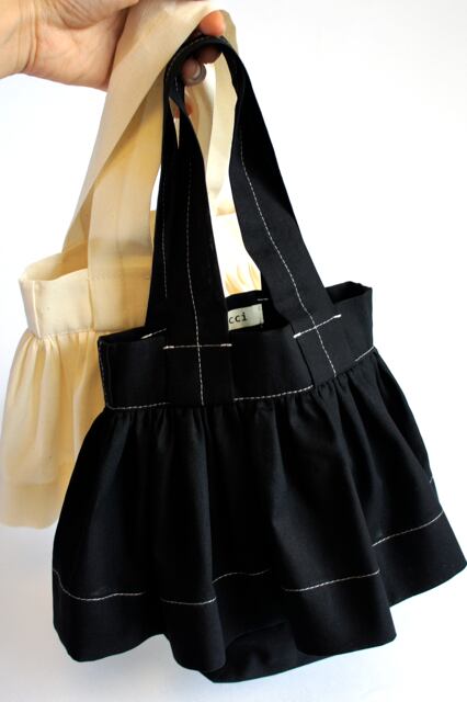 綿のシーチングで作った、たっぷりギャザーのチュチュをイメージした、フワフワかわいいミニトートです。